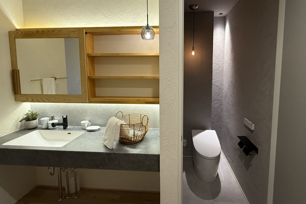 COZY GLAD の内外装は「ESTUCO WALL エスタコウォール」を使用しております。スペイン南部「アンダルシア」から切り出された大理石を主原料とした自然素材。内外装共にデザイン性に優れ、間接照明、ブラケットライトを多用する事で、漆喰の陰影が浮き上がり、漆喰の魅力を最大限に引き出します。大切な家を一生守り、ずっと飽きない、ずっと付き合える天然漆喰。