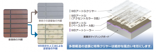 WBアート多彩仕上げ工法は、単色でべた塗するのではなく、特殊工法によってデザイン性が高く、耐久性に優れた外壁塗装が可能です。