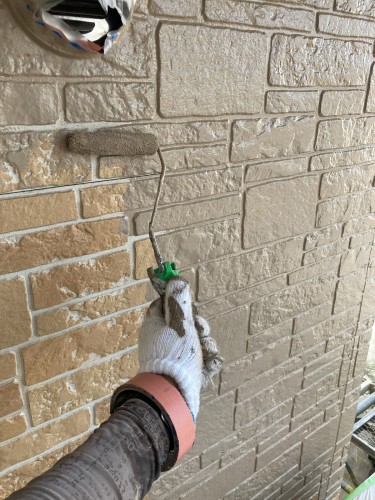 いよいよ塗装開始です。外壁にプライマーを塗布し塗料の密着しやすくします。既存の塗膜が下からはがれて、せっかく上に塗った塗料が浮いてしまうことを防ぎます。