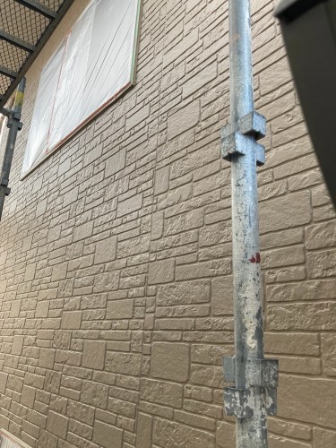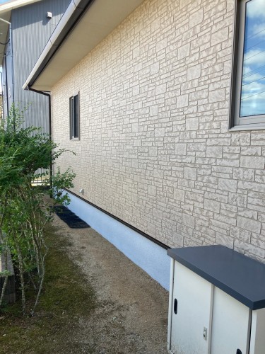 基礎部分も石目調の塗料で仕上げました。当社ならではのこだわりとして、仕上がりに「三分艶」を採用しています。この仕上がりは、塗装後の光沢が控えめで塗りたて感が出ずに、美しい外観を実現できます。さらに当社では、外壁だけでなく雨樋や破風板といった細かな付帯部分にも三分艶を使用し、全体の統一感を大切にしています。隅々まで丁寧に仕上げられた、まるで新築のような美しい状態を長期間維持することが可能です。