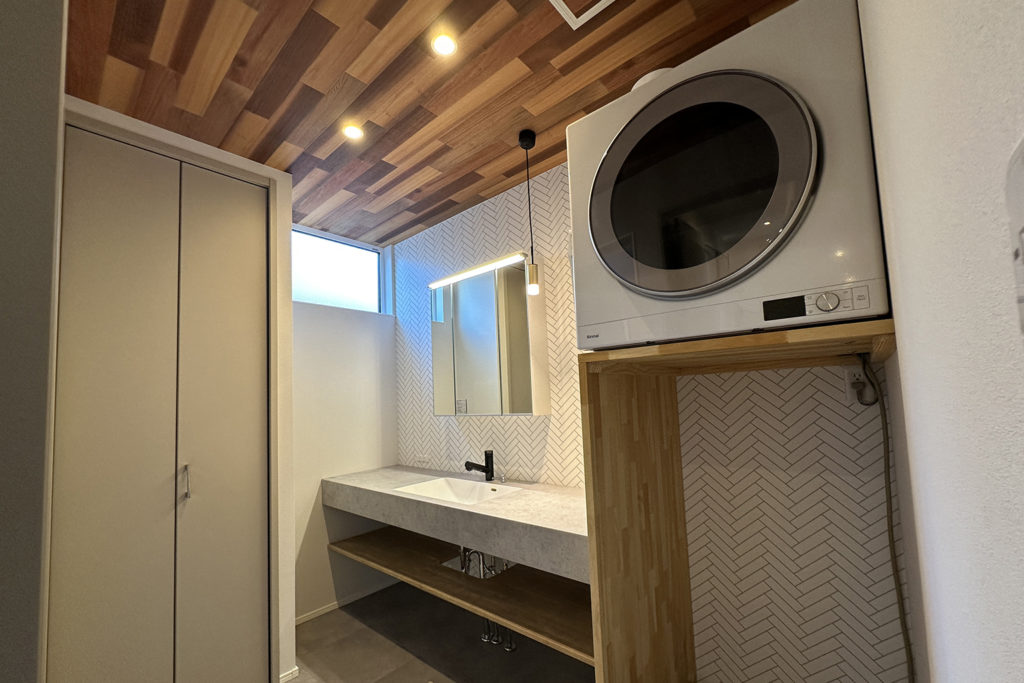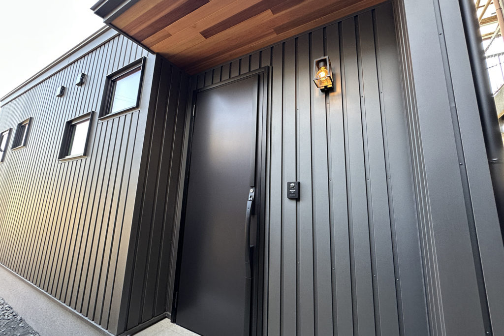 外観はブラックのガルバリウム鋼板をベースに、玄関まわりへレッドシダーをアクセントとして使用。庇を設けることで立体感を持たせ、素材のコントラストが映えるデザインに仕上げました。コンパクトながらも存在感のある佇まいです。
