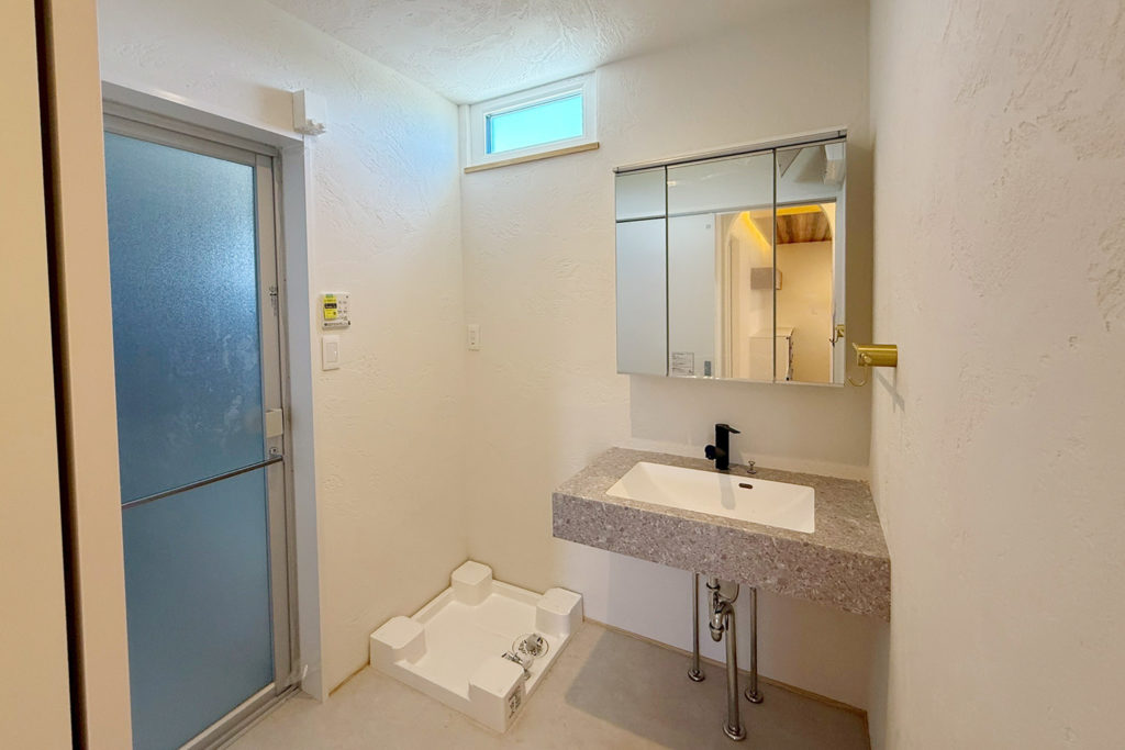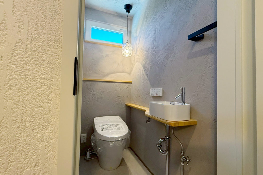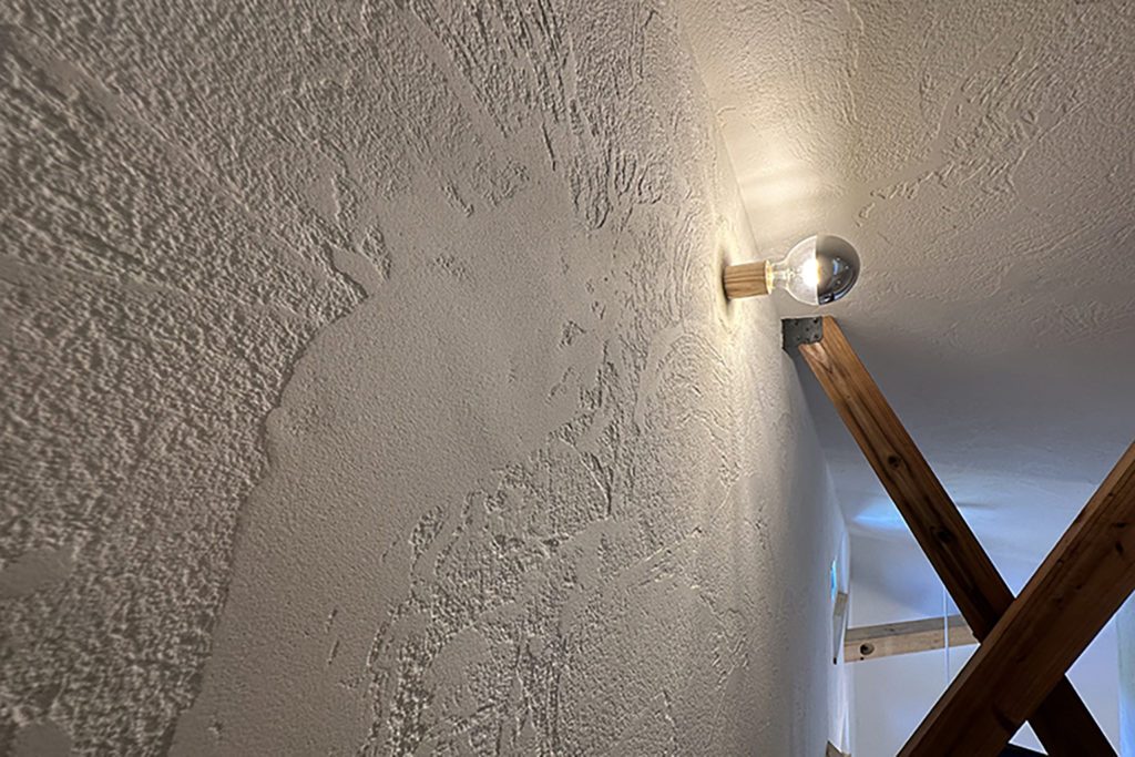 室内スペイン漆喰仕上、塗り模様が美しく照明効果も楽しめるスペイン漆喰「エスタコウォール」。調湿・消臭効果もあり機能的です。