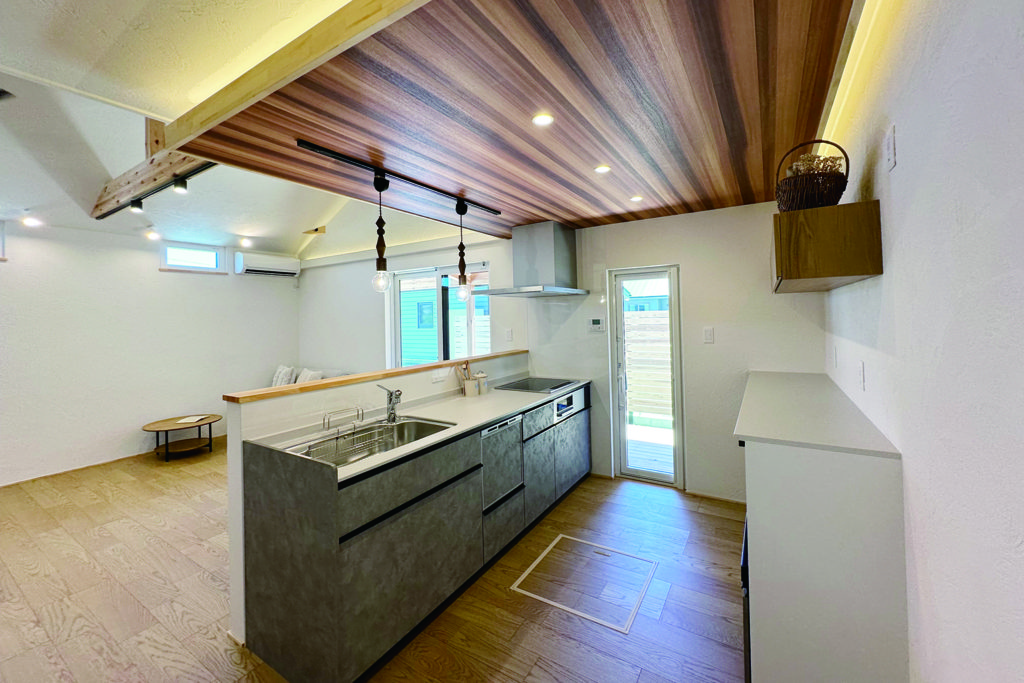 飽きのこないシンプルで洗練されたモダンな外観デザイン。プライバシーを確保するウッドフェンス付きです。広々としたリビングスペースと開放感あふれる吹抜けが特徴。大きな窓からは自然光がたっぷり差し込み明るく快適な空間です