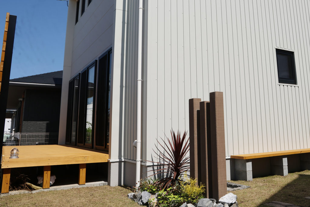 天然芝にベンチを配置した玄関アプローチ。ウッドデッキを活かしたガーデニングやアウトドアライフやBBQ、家族での団らんなど、おうち時間を豊かに楽しむライフスタイルにも対応。