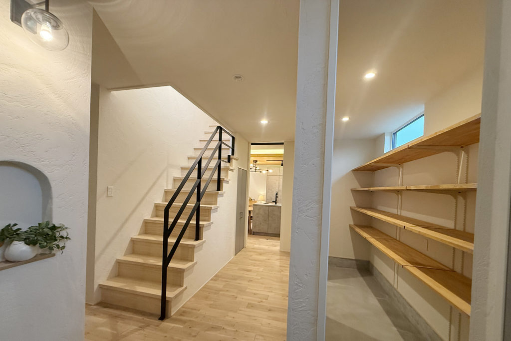 アウトドアを楽しむご家族のために、玄関から直接つながる大容量の土間収納を設けました。外で使った道具をそのまま持ち込めるため、室内を汚さずに収納できます。