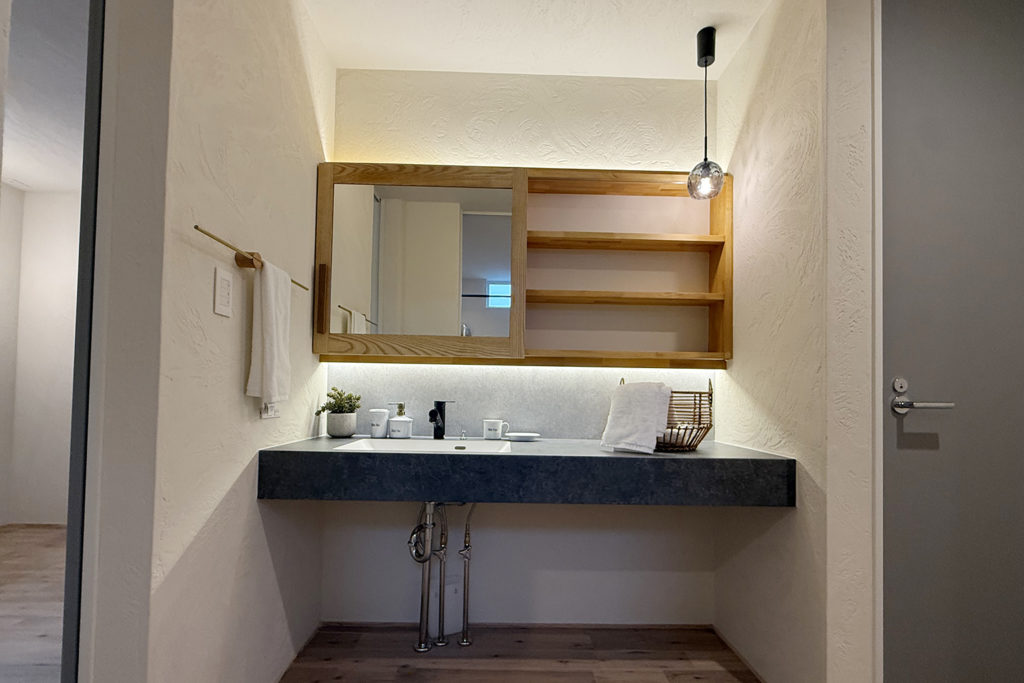 玄関からトイレと寝室の間に配置した独立洗面は、来客時も使いやすく、生活感を抑えた間取り。帰宅後すぐの手洗いや身支度がスムーズに行えます。